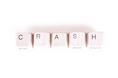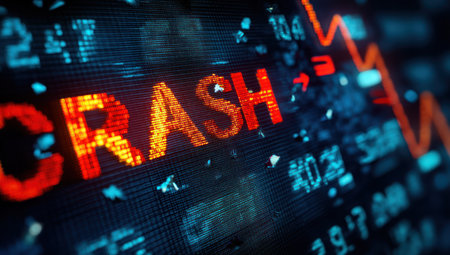 The image features a digital display with financial data and the word CRASH in bold, red neon letters. The composition includes sharp lines and a dark background. The scene suggests a financial downturn or crisis, potentially suitable for editorial or commercial applications related to business or economics.