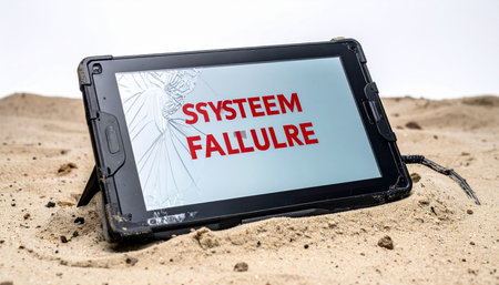 In the vast, unforgiving desert, a rugged tablet, the last link to civilization, displays a catastrophic system failure message on its cracked screen. A symbol of technological breakdown in a harsh environment, representing data loss, isolation, and the fragility of our digital world.