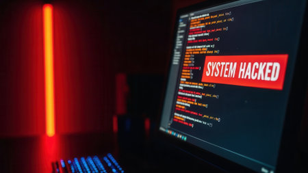 A computer screen displaying code with a prominent red SYSTEM HACKED banner, illuminated by a red light, symbolizing a cyber attack.