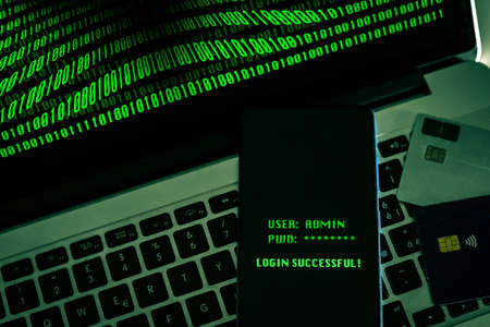 Laptop with green numbers on display. Credit cards, smartphone displaying successful login with credentials user and password. Remote banking technology, security privacy, hacker, cyber crime concept