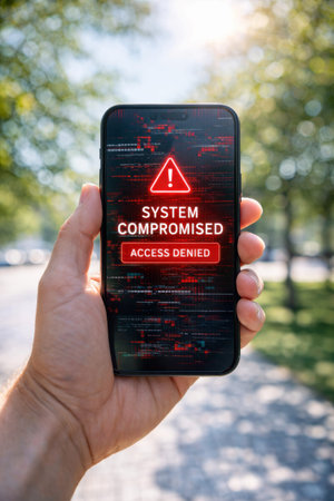 A smartphone shows a warning message indicating system compromised while held outdoors