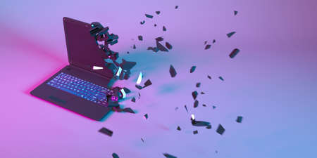 Exploded view of silver laptop computer with hardware components flying out in dark gray background
