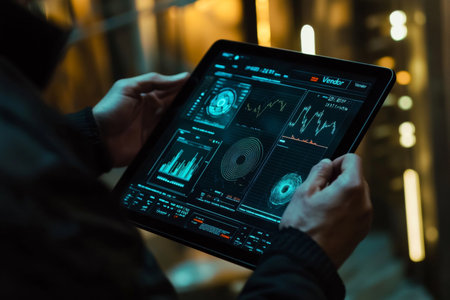 Individual holds a tablet displaying collapsing dashboard data while seated in a dark environment. The focus is on data analysis.