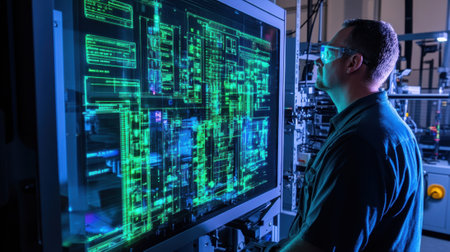 A technician stands in front of a large assembly machine an AR display illuminating critical operation points reinforcing procedural adherence in complex tasks