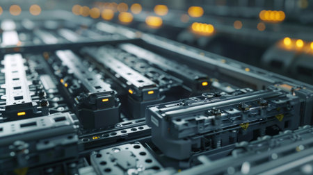EV Battery Production Factory. Close-up of Lithium-ion High-voltage Battery Components for Electric Vehicle or Hybrid Car. Battery Module for Automotive Industry Production Line.