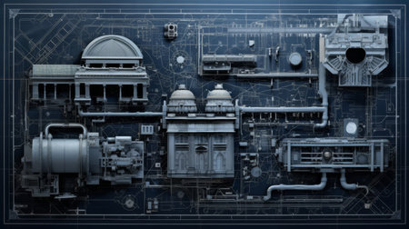 This image showcases a detailed overhead view of an industrial layout, featuring vivid yellow machinery and pipes. Ideal for themes of technology and modern design.
