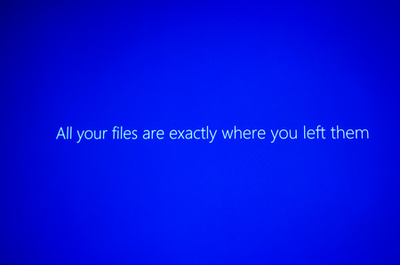 PARIS, FRANCE - JAN 7, 2016: All your files are exactly where you left them message on computer display during Windows 10 upgrade
