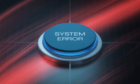 Blue button displaying SYSTEM ERROR text, illuminated by a glowing blue ring, set against a dark, abstract digital background with dynamic red light streaks, symbolizing a critical technical issue or malfunction.