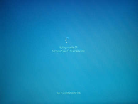PARIS, FRANCE - JAN 7, 2016: Configuring update for microsoft Windows 10 operating system OS with percentage bar and message to not turn off the computer - message on red background
