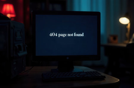 Dark room with a computer monitor showing a '404 page not found' error message, creating a moody atmosphere. The scene includes soft lighting and a workspace setting, ideal for design use