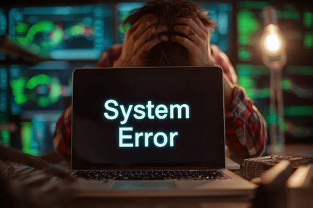 Stressed individual staring at laptop displaying system error while surrounded by screens in a dimly lit workspace during late evening hours