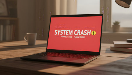 Working from home on a laptop encountering a critical system crash and kernel panic with a red screen, indicating a technical issue and unexpected software failure