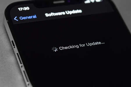iPhone with Settings, iOS update on screen, Checking for Update. Apple is a multinational technology company. Moscow, Russia - September 5, 2021