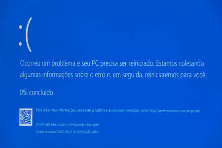 Fuji City, Shizuoka Prefecture, Japan - March 15, 2020: Blue Screen of Death (BSoD) - Windows 10 operating system problem message, text on screen in Brazilian Portuguese.