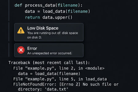 Error and notification screen with code and warnings displayed on computer interface highlighting low disk space and unexpected error alert.