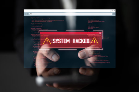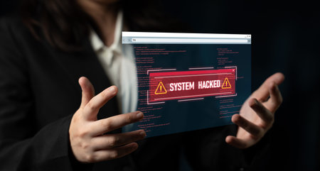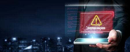 Cybersecurity breach alert on a laptop screen showing “system hacked†warning message, concept of data protection, cyber attack, hacking, computer security risk, and information safety crisis.
