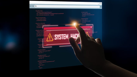 A bright red alert notification warns of a system hack, with hands reaching out overhead, symbolizing urgency and the importance of cybersecurity in a digital age. Raster