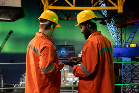 Offshore rig technician using laptop reviews AI LLM generated insights to improve drilling accuracy. African american engineer uses predictive artificial intelligence model to prevent malfunctions