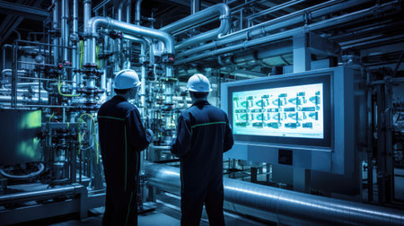 Engineers Working on a Large Control Panel in a Power Plant. AI generative