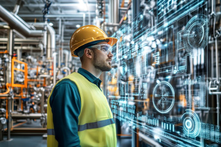 An engineer in safety gear interacts with data visualization charts amidst robust bioprocessing equipment, highlighting modern industrial technology and innovation.