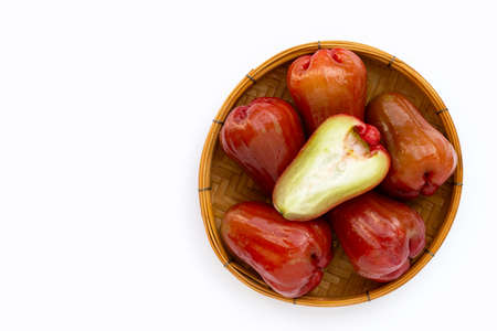 Fresh rose apple in bamboo basket on white background.