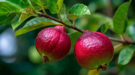 Two fresh ripe red guavas hang on a branch, ready to harvest.