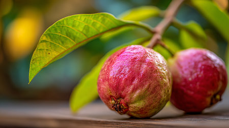Two fresh guava fruits resting on rustic wooden planks with bright lighting