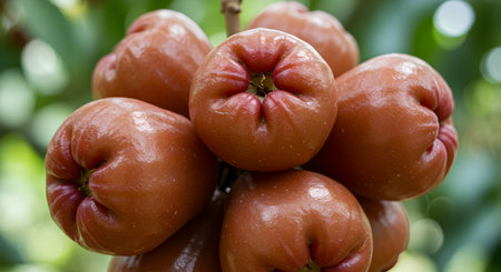 Fresh red rose apples hanging on a tree branch, displaying glossy skin, rich natural texture, and a vibrant tropical atmosphere surrounded by lush green leaves in an outdoor setting.