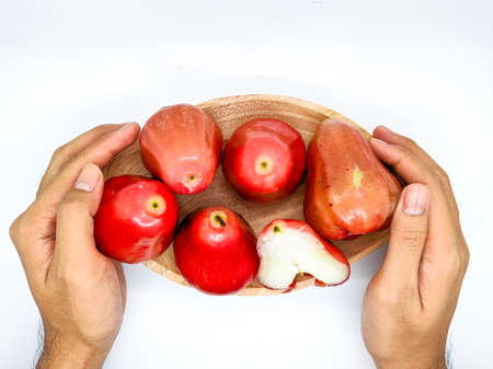 fresh premiun quality rose apple or Syzygium samarangense with wooden bowl isolated on white background. Also known as wax apple, Java apple, Semarang rose-apple, wax jambu and jambu citra.