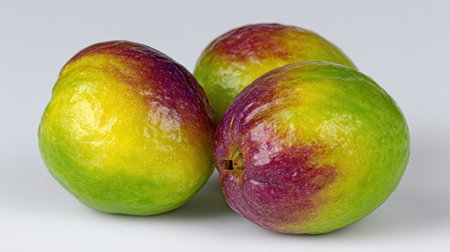 Three vibrant fruits showcase their shiny skin in a stunning display of colors