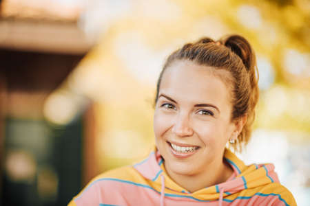 A smiling Caucasian young beautiful woman from France, embodying warmth and joy. Her relaxed demeanor and carefree expression convey a sense of happiness and approachability. Generative AI.