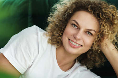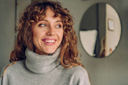 Portrait of beautiful smiling woman with curly hair wearing sweater near mirror. Selective focus.