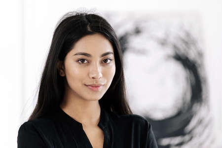 Graphic portrait of elegant young woman wearing black in modern art gallery, copy space