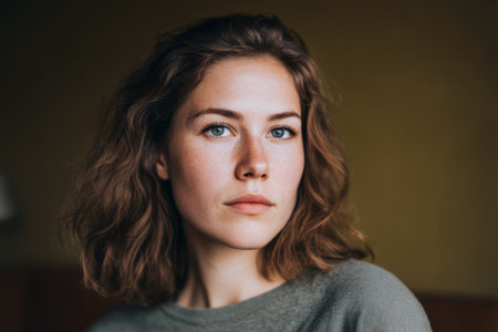 Outdoor portrait of beautiful young woman with wavy hairstyle, wearing knitted green pullover