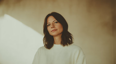 Young woman stands in an indoor space with soft natural light. She has long dark hair and a relaxed expression while wearing a sweater. The background is simple and neutral.