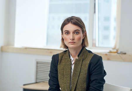 Portrait of a beautiful young woman in a white sweater against the background of the window