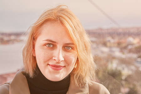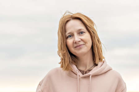 Portrait of a pretty girl with long red hair on a blurred background. Woman portrait without retouching with her natural imperfections