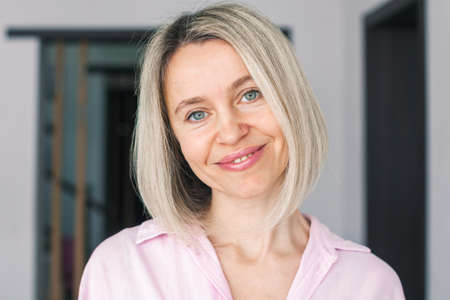 Head shot close up middle aged pretty Caucasian woman looking at camera, feeling happiness alone at home. Excited emotional positive adult smiling lady