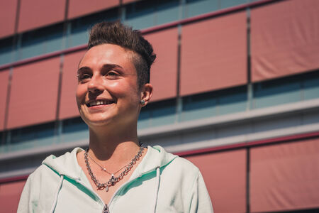 Non binary hispanic transgender mid Tomboy. Androgynous authentic identity for gender and sex education