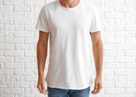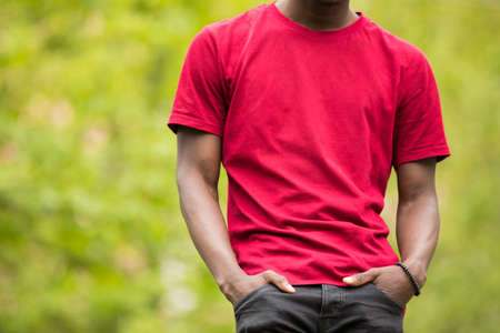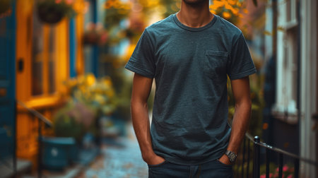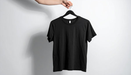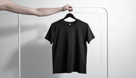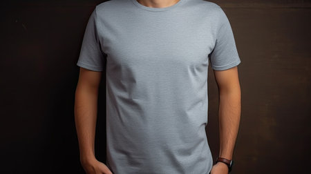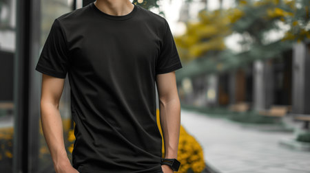 Cropped image of a man wearing a plain black t-shirt, suitable for apparel mockups