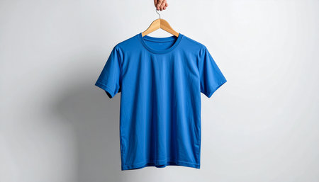 A plain blue t-shirt with short sleeves and a round neckline hangs on a wooden hanger against a light gray wall.