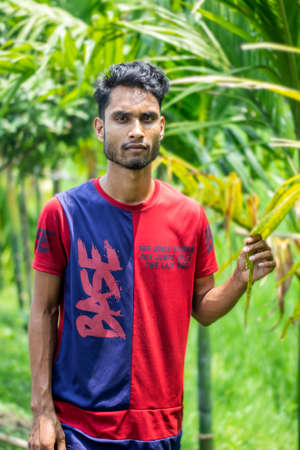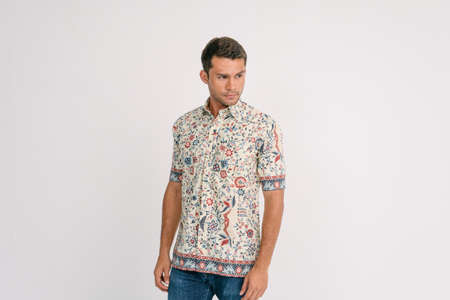Handsome Asian Male model wearing casual batik shirt isolated over white background.