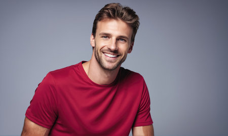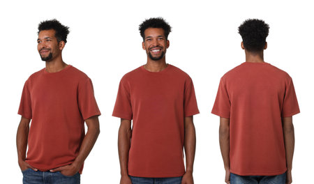 Red t-shirt mock up, front, side and back view, isolated. Male model wear plain red shirt mockup. Tshirt design template. Blank tee for print