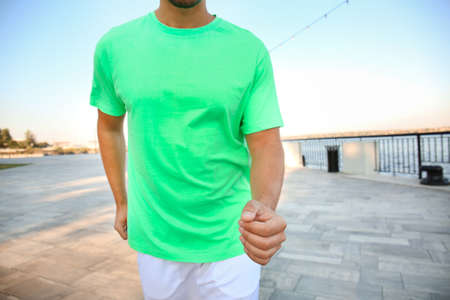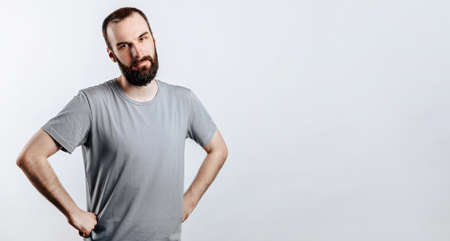 Man in black t-shirt, closeup. Collage of photos on grey background. Mockup for design