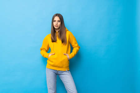 Closeup portrait of beautiful casual caucasian girl posing and looking at camera isolated on blue studio wall