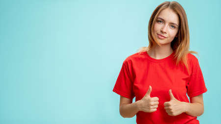 Like gesture. Special offer. Portrait of satisfied confident woman in red t-shirt approving choice with thumbs up smiling isolated on blue copy space advertising background. Agreement acceptance.