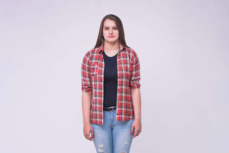 portrait of a beautiful brunette girl on a white background in jeans in different poses with different emotions. She is standing right in front of the camera smiling and looking happy