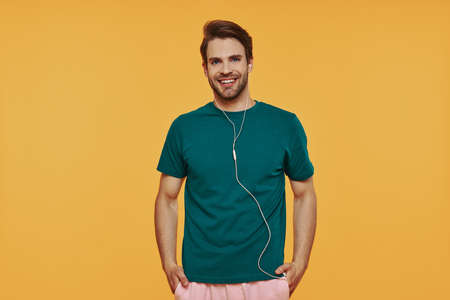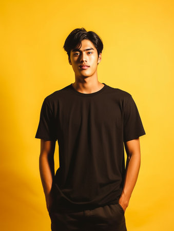 A man stands in front of a solid yellow wall wearing a casual yellow shirt. He shows a calm demeanor against a vibrant backdrop.