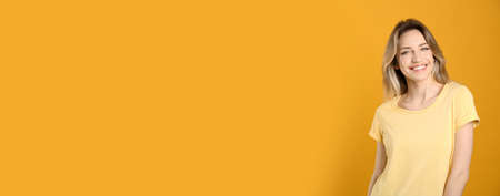 Portrait of happy young woman with beautiful blonde hair and charming smile on yellow background. Space for text