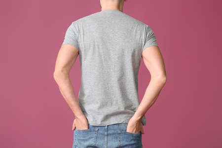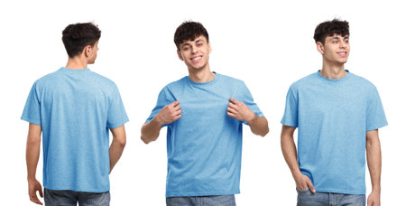 Collage with photos of man in light blue t-shirt on white background, back and front views. Mockup for design